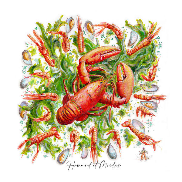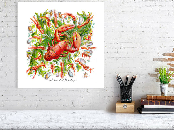 Unframed, quality fine art print of lobster, weed and mussels.Perfect for a kitchen, cafe or seaside dwelling.